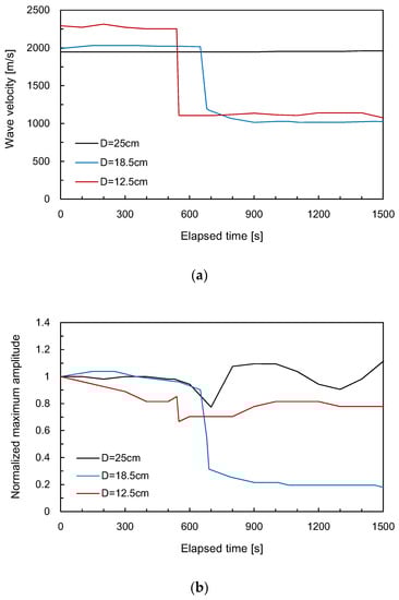 The maximum amplitude measured for each output signal was normalized with that measured for the output signal before heating. Figure 9b shows the variation in the normalized maximum amplitudes with elapsed time. In the initial stage, the normalized maximum amplitudes for the hole-to-face distances of 12.5 and 18.5 cm gradually decreased and then rapidly dropped around the elapsed time of 540 and 650 s, respectively. After the drop with the maximum amplitude, the normalized maximum amplitudes remained almost constant with time. Interestingly, the normalized maximum amplitudes for the hole-to-face distance of 25 cm significantly dropped around 700 s after the stable amplitude variation at the initial stage. This decrease was probably because of crack propagation from the side opposite to the location of installation of the transducers.