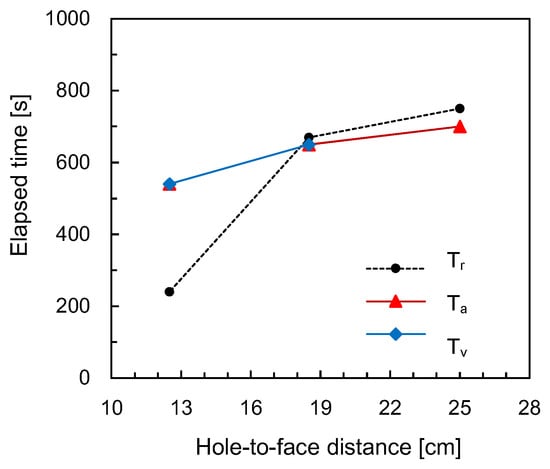 The surface of the rock specimen was observed by the naked eye during the expansion test to investigate crack propagation. For the three rock specimens, the crack propagation on the surface was located at the midpoint of the width of each specimen, as shown in Figure 6. The elapsed time at the moment that the crack was propagated on the surface of the rock specimen was recorded. The elapsed time corresponding to crack propagation (Tr) along the hole-to-face distance is plotted in Figure 10. For the hole-to-face distance of 25 cm, the elapsed time corresponding to the crack propagation was 750 s. The elapsed time corresponding to crack propagation decreased with a decrease in the hole-to-face distance. For a hole-to-face distance of 12.5 cm, the crack generated on the surface of the rock specimen was detected at 240 s.