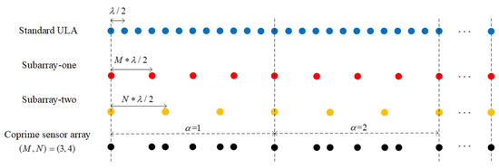In this paper, the CA structure is composed of two co-prime subarrays. The positions of the 1st sensor in the two subarrays coincide, and the sensors in each subarray are arranged evenly and equidistantly. The inner spacing of sensors in the two subarrays is co-prime. As shown in Figure 1, the co-prime pair of the two subarrays is , where M and N are both positive integers , and the array expansion factor is . In subarray one, the number of sensors is and the inner spacing is . In subarray two, the number of sensors is and the inner spacing is . is the half-wavelength of the impinging signal. Conventional beamforming (CBF) is employed as the signal processing method in this paper for conciseness, which can be further upgraded to MVDR methods or other robust beamforming algorithms. The scanning range is .