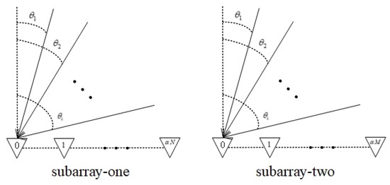 In Equation (3), is the additive white Gaussian noise with unknown variance at the nth receiver sensor of subarray one, and is the noise at the mth receiver sensor of subarray two, . is the relative time lag for the kth signal at the nth sensor in subarray one, and is the relative time lag for the kth signal at the mth sensor in subarray two. With Equation (2), Equation (3) can be expressed as