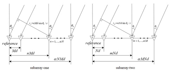 The first sensor of the two subarrays is shared at the coordinate origin as reference sensor. The relationship between the sensors in two subarrays and the reference sensor is shown in Figure 3. There is a wave-path difference between the two sensors in each subarray. The wave-path difference between the nth sensor and the reference sensor of subarray one is , and the wave-path difference between the mth sensor and the reference sensor of subarray two is . Different wave-path differences lead to different phase lags