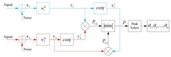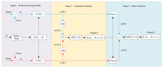 In Equation (21), due to the properties of noise, . The phase information of the spatial cross-spectrum is extracted, i.e., . The element spacings are different in the two co-prime subarrays; hence, the delays from element to element should be different as well if a plane wave is observed. Ideally, in the true target direction, the phase differences extracted from the beam-domain outputs of the two subarrays are the same, while in the direction of the spurious peaks, the phase information is generally different. Thus, to deal with the spurious peak problem, the phase feature can also be exploited. Therefore, there are two processing stages to get the true peaks. The inputs and outputs in each stage are shown in Figure 5.