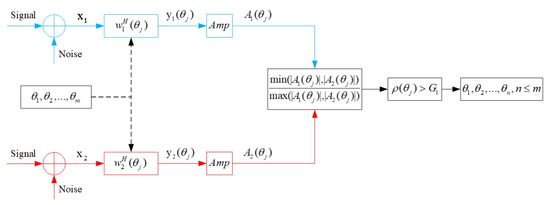 By deduction of the above sections, the signal amplitude characteristics are introduced to identify the spurious peaks. In consideration of the amplitude characteristic of signals in real-world scenarios, we make an amplitude hypothesis. For the true target directions, the amplitude differences of the normalized outputs between the two subarrays are small; while for the spurious peak directions, the amplitude differences of the normalized outputs between the two subarrays are big. This is true for ideal sensors, but in practice each sensor has its own gain, which is direction dependent. In this paper, the sensors are assumed to have ideal omnidirectional gain patterns. The outputs of subarrays are normalized to the reference sensor, which will only eliminate the noise. As a matter of fact, the possibility that two sources with the same amplitude, phase, and distance appear in different directions is low [29]. Therefore, this case will not be included in this paper. Because of this, there will be an amplitude threshold to evaluate the peaks from the product selection. The directions that cannot meet the threshold will be eliminated, as is shown in Figure 6.