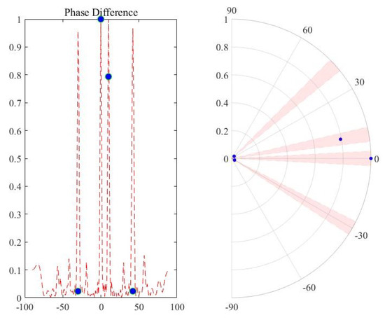 After the amplitude selection, there may still be some spurious peaks that satisfy the amplitude threshold, and the phase information of the spatial cross-spectrum can be exploited. In consideration of the phase characteristics of signals in real-world scenarios, we make a phase hypothesis. For the true target directions, the phase differences extracted from the beam-domain outputs of the two subarrays are small; while for the spurious peak directions, the phase differences extracted from the beam-domain outputs of the two subarrays are big. The phase differences extracted above correspond to the spatial cross-spectra of the two subarrays. Since the sensor displacements are different, the delays will be different in the two co-prime array components. Take two targets in directions of and for example, the phase is extracted in Table 1, and Figure 7 also illustrates the case. Because of this, there can be a phase threshold to evaluate the peaks from the amplitude selection. The directions that cannot meet the threshold will be eliminated, as is shown in Figure 8. The normalized beam-domain outputs in the directions of are