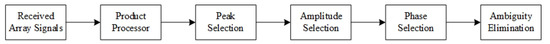 In this paper, co-prime array geometry is employed. The processing flow is shown in Figure 9. To start with, the subarray CBF is utilized to obtain the initial directions. Then, the beam-domain outputs of subarrays in each bearing are conjugated and multiplied to obtain the peaks of the correlation spectrum with the ambiguity being eliminated. Based on this, the amplitude information from two subarrays is exploited to further discriminate the spurious peaks with the amplitude threshold. After that, the phase information is exploited to pick out spurious peaks that have not been distinguished by the amplitude selection stage. Finally, all spurious peaks in the spatial spectrum can be identified, and the ambiguity will be eliminated. Following the steps in the processing flow, the true directions of targets are more deterministic, which is beneficial to interesting fields such as UUV sonar arrays [31].