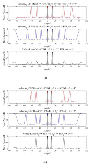 In this situation, the spurious peaks can be eliminated by product processing, but when the direction of targets changes to , the spurious peaks cannot be eliminated, as is shown in Figure 10b. Since the main beamwidth of the beamformer is about , the second target is located out of the beam range.