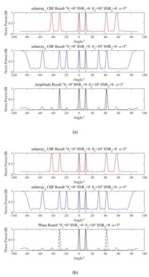 In Equation (8), is the weighted outputs of subarray one, and is the weighted outputs of subarray two. When the ideal weight vectors and are fixed, the power and of the outputs in direction of can be calculated: