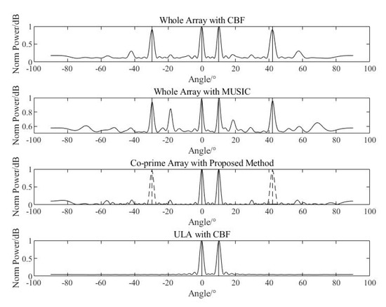 After the processing flow is simulated, the spatial spectrum obtained by CBF of whole array, the spatial spectrum obtained by MUSIC of whole array, the proposed method with co-prime array in this paper, and the half-wavelength ULA with the same aperture are compared.