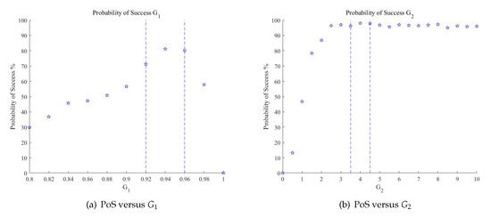 The conditions of simulation remain unchanged, and the parameters of targets remain the same as in the last section. In the processing flow, the amplitude selection is achieved before the phase selection, and the relationship between PoS and is simulated. The range of amplitude threshold is adjusted from 0.8 to 1 with the interval 0.02. For each , 500 Monte Carlo experiments were conducted, and the PoS versus is obtained. As is shown in Figure 14a, the PoS goes steadily up with the increase of . The amplitude threshold gradually eliminates the angle which is not qualified to it. When , the PoS reaches the max with PoS = 81.2% and the value of near is recommended to be the amplitude threshold. In this range, the amplitude selection can guarantee at least PoS = 70%. Then, the PoS goes down until PoS = 0 when . In this situation, the threshold is too high and approaches the ideal circumstance, which is not a good range for the selection of .
