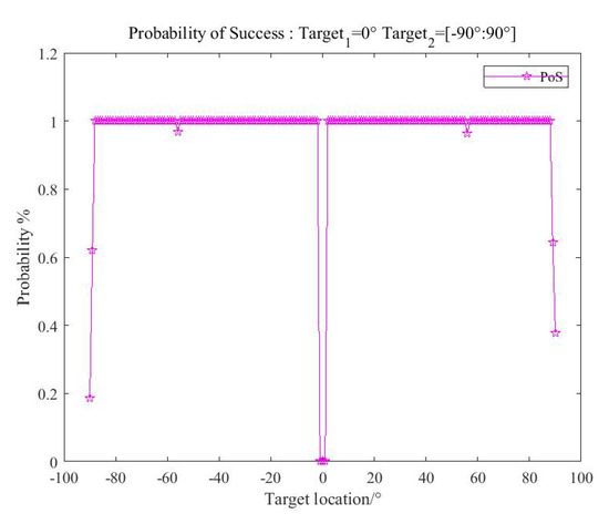 As is shown in Figure 15, when target two is located in the direction of , the PoS decreases significantly. This is caused by the overlap of the two signals, which has been discussed in Section 3. When , the end-fire direction of the array, the DOA ability of the array decreases obviously. While in most directions, the PoS remains stable with little fluctuation.