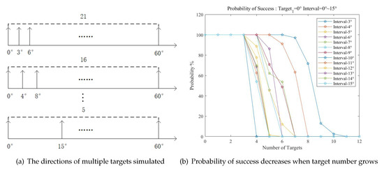 As is shown in Section 3, when the number of targets increases, the number of spurious peaks will continue increase. The simulation of PoS versus the number of targets in a certain range is carried out. The SNR of targets are fixed between 0 dB and 3 dB. The direction of target one remains unchanged at , and the direction of other targets changes with different angle intervals from to , as is shown in Figure 16a. In each case, 1000 Monte Carlo experiments were conducted, and the PoS was obtained.