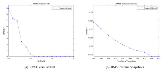 The root-mean-square error (RMSE) of the method proposed in this paper versus SNR and the number of snapshots are next investigated over 1000 independent Monte Carlo simulations. The RMSE of DOA estimation is calculated as