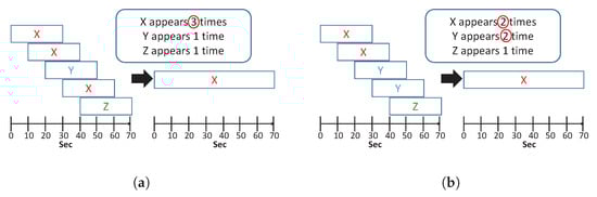 Each TAA sensor sampled a three-axis acceleration vector at a time. Typically, principle component analysis (PCA) is used to combine the three-dimensional (3D) acceleration vector into 1D signal for the following analysis. Although PCA is suitable when the recording time is short, this approach is insufficient for overnight recording. The PCA could possibly distort the useful information of sleep breathing features because of the nonstationarity, particularly when the selected axis is switched frequently because of change in the sleep position. Thus, a TAA selection method was proposed to avoid this problem as shown in Figure 3. Three-dimensional TAA signals were first segmented by 30-s window with a 10-s time step. The number of periodic peaks was counted in a segment of an axis. Then, the axis with the most similar number of peaks to the human average respiration rate (6–9 peaks per 30 s) was selected as the output axis. After determining the selected axes of five successive segments, the most frequent axis in the previous five segments was selected as the output signal for the following analysis, as depicted in Figure 3a. If two axes had equal appearances, the axis with the larger magnitude was selected, as depicted in Figure 3b.