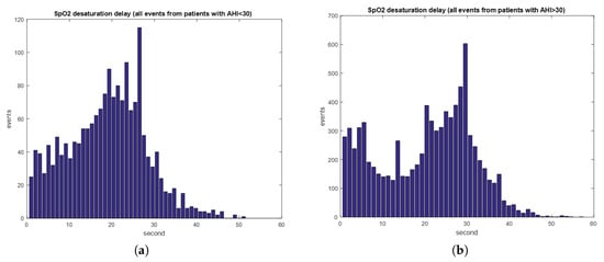 (a) SpO2 desaturation time of patients with AHI lower than 30; and (b) SpO2 delay time of patients with AHI higher than 30.