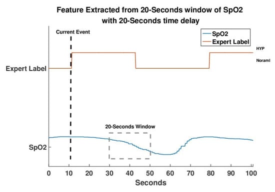 SpO2 is the percentage of oxyhemoglobin in hemoglobin. When sleep apnea and hypopnea events occur, SpO2 decreases gradually until the subject breathes again. According to our data, the average delay time between an apnea (hypopnea) event and the drop of SpO2 was s. The average event duration is . Figure 4a,b displays the distributions of the desaturation delay times of all events for the patients with AHI > 30 and AHI < 30, respectively. For patients with severe symptoms (AHI > 30), the desaturation distribution exhibits a high probability of error in which the previous respiratory event related to desaturation is labeled as the current event, that is, the desaturation drop of the previous respiratory event is almost adjacent to the current event. Therefore, features of SpO2 were generated for every 20-s segment with a 20-s delay from the sampling point, as depicted in Figure 5. The minimum, maximum, mean and variance of the first derivative were used as the four features, and the original SpO2 signal was also reserved as the baseline. To eliminate the variation of subjects, the SpO2 signal was normalized by subtracting it by its median and dividing the obtained value by its standard deviation.