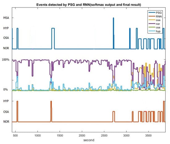 Figure 6b illustrates the LSTM-RNN architecture, which has three layers, namely the input, LSTM-cell hidden and output layer. The input layer consists of nine neurons corresponding to nine extracted features from the THO/ABD and SpO2 signals. The output layer contains four neurons representing four types of events, namely the OSA, CSA and HYP events and NOR breathing. The output of the network was normalized by using the softmax function. In total, 80 LSTM cells were utilized in the hidden layer according to the thumb of rule. The upper bound of the hidden neuron number was calculated by dividing the number of cases in the training dataset by the sum of the numbers of input and output layers in the network. The LSTM-RNN model was trained with 500 epochs of 500 batches of Adam gradient descents and a learning rate of 0.001. The activation function used in each layers was the rectified linear unit (ReLU) because of the benefit of sparsity and its capability of reducing the vanishing gradient. The loss function was used to compute the sum of cross entropy and L2 regularization with . Moreover, gradient clipping was added to the loss function to avoid the exploding gradient. Figure 7 illustrates the event detection results of 1-h segment for a patient. The PSG labeling results obtained from experts are displayed in the top panel of Figure 7. The middle panel displays the softmax output results of the LSTM-RNN classifier. In this panel, the four curves represent the probabilities of the four types of events. The decision rule of the LSTM-RNN classifier involves selecting the event with the highest probability in every time step, as depicted in the red line in the bottom panel. The LSTM-RNN classifier generates almost the same event states as PSG labeling does.