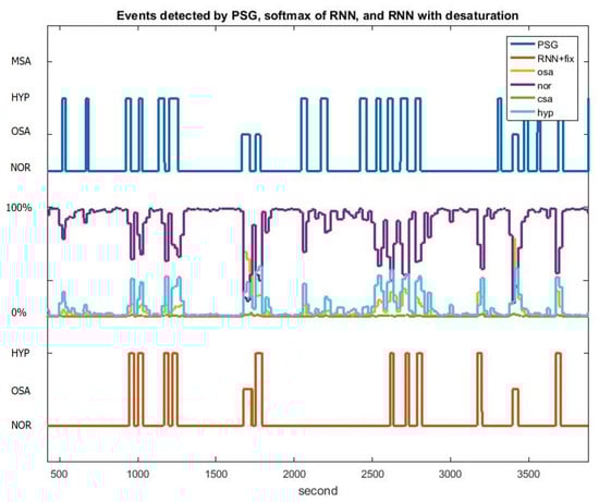 Event classification results of PSG labeling, the LSTM-RNN softmax outputs and the final results of the LSTM-RNN classifier with desaturation detection during 1-h sleep of a subject.