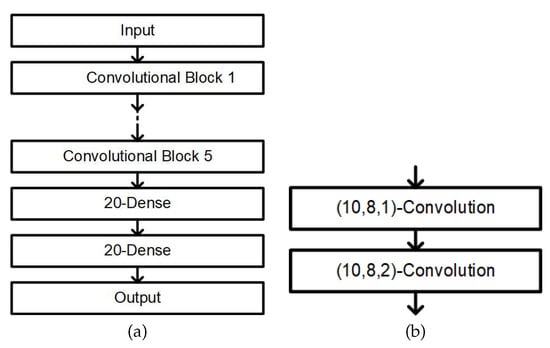 (a) Architecture of the one-dimensional CNN. The notation 20-Dense denotes that the fully connected layer possesses 20 nodes. For 5-min input signals, we used five convolution blocks []. (b) Architecture of a single convolution block. The notation -convolution denotes that the convolutional layer has f filters with a kernel size k and stride s. The output of the block is half the size of the input []. A bias is added to the output of each filter, and the result is fed into a rectified linear unit (ReLU) activation function. A dropout with probability 0.5 is applied to the last layer and both fully-connected layers. The output of the network is normalized by the softmax function. An epoch is predicted to be wake if the output of the wake node is greater than or equal to that of the sleep node. We refer readers to Section 2.3 of [] for more details.
