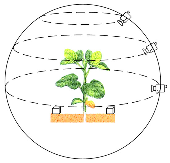 The experimental data was collected from a vegetable planting plot (35.28 N, 114.64 E) in Xinxiang, China. The time of collection was April 2020, and the crops leaf beet (Beta vulgaris L. var. cicla L.) were randomly selected for collection. Using a smartphone that has a camera with 20 million pixels, the video recording resolution was set to 2880 × 2160, the video frame rate to 30 fps, the exposure to automatic, and the focus mode to manually focusing before each shot. Recording around the crop was carried out in the most stable manner. In order to obtain as much plant information as possible, the recording distance was set to 30–45 cm of the center of the plant, and each plant was recorded three times at an angle of 0 degrees, 45 degrees, and 75 degrees relative to the ground plane. The recording method is shown in Figure 1.