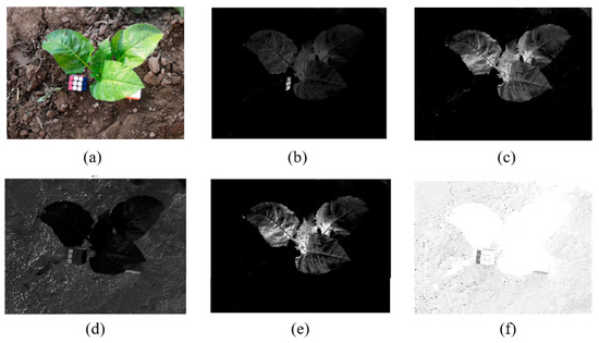 Images using different indices: (a) original image; (b) NDI image; (c) ExG image; (d) ExR image; (e) ExGR image; (f) VEG image.