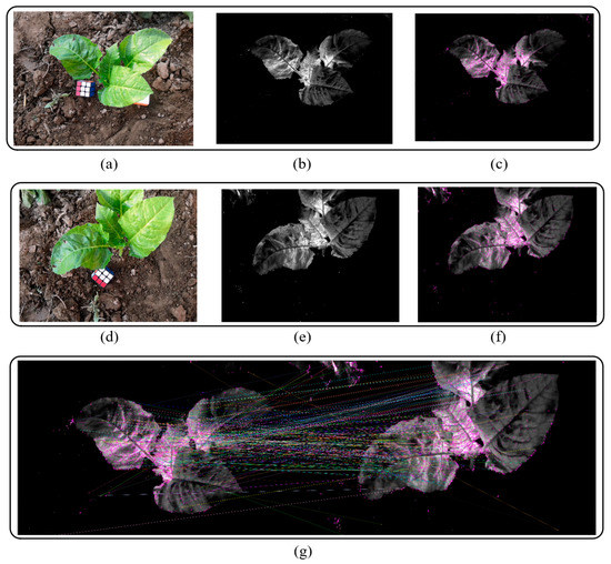 Key frame extraction. (a,d) original images; (b,e) ExGR images, (c,f) scale-invariant feature transform algorithm (SIFT) feature images; (g) matching image.