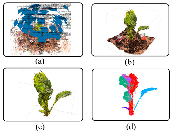 Due to the high resolution of the captured images, reconstructed high-precision point clouds often contain hundreds of thousands, or even millions of orders of magnitude, which results in a huge amount of calculations for point cloud processing [33]. In order to improve the efficiency of point cloud processing, MeshLab software is commonly used to simplify the point cloud, reducing the number of point clouds per plant to approximately 10,000–30,000, which effectively reduces the amount of calculations and has little effect on the accuracy of point cloud processing [10].