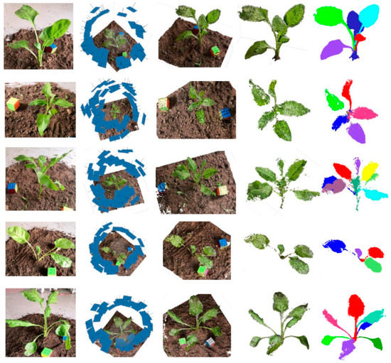 On the basis of obtaining the plant image sequence, reconstruction software was used to generate the point cloud, and then the pipeline proposed in this paper was used to obtain the point cloud skeleton and the segmented point cloud. The results show the excellent performance of the key frame extraction method proposed in this paper. Figure 6 shows the five sets of results of this experiment, including, from left to right, the original images of the crop, the 3D position results of the image sequence extracted from the video, the results of the dense point cloud, the results of the ground removal and the filtered point cloud, and the results of point cloud segmentation.