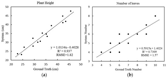 For plant height (Figure 7a), the RMSE is 1.82 cm and the MAPE is 5.12%, and the fitting equation shows that the system has a strong explicit correlation between the estimated height and the actual height, which shows the accuracy of the system’s calculation of plant height. For the number of leaves (Figure 7b), the RMSE is 1.57 and the MAPE is 17.78%, which means that the system results deviate from the actual results. The results of the system were estimated by calculating the number of skeleton branches of the plant; a single branch of some green leafy vegetables grew multiple leaves, causing inaccuracy of the skeleton branch calculations, thus resulting in the system being biased.
