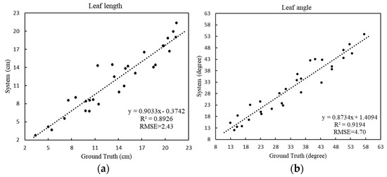 For the obtained point cloud model, the plant height, the number of leaves, the length of the leaf branches, and the angle of the leaves were calculated according to the designed pipeline. In order to verify the accuracy of the designed algorithm, the values obtained by the system were compared to the results of the manual measurements. Finally, a regression analysis was performed on both sets of data, and the root-mean-square error and the mean absolute percentage error were calculated.