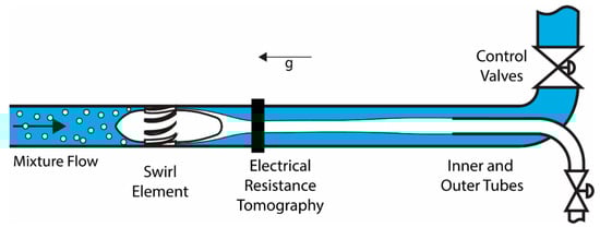 The working principle behind a swirl separator is the centrifugal force. When a mixture of two phases of different densities is pushed through the swirl element, angular velocity is created, and centrifugal forces take place, forcing the phase with higher density toward the pipe wall and creating a core structure with the less dense medium in the center []. The efficiency of the separation is determined by the location of the fluids (phases) at the entrance of the two outlet ducts [].
