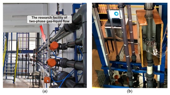 The experiments were performed using the two-phase liquid/gas flow facility of the Tom Dyakowski Process Tomography Laboratory at the Lodz University of Technology (TUL). The liquid/gas flow facility consists of horizontal and vertical flow loops of three different pipe dimensions (outer diameters: 90 mm, 50 mm, and 30 mm), as shown in Figure 3a. The flow loop consists of a buffer tank, followed by a centrifugal pump and a flow meter. Tap water of electrical conductivity 60 mS/m [] was used in the installation. A compressor of 5 bar capacity was used to produce gas, which was injected in the flow installation using the Brooks Mass Flow Controller (MFC). The valve operations and Brooks control were carried out using National Instruments (NI) system. The experiments were conducted using the vertical pipe of the 90 mm outer diameter, as shown in Figure 3b.