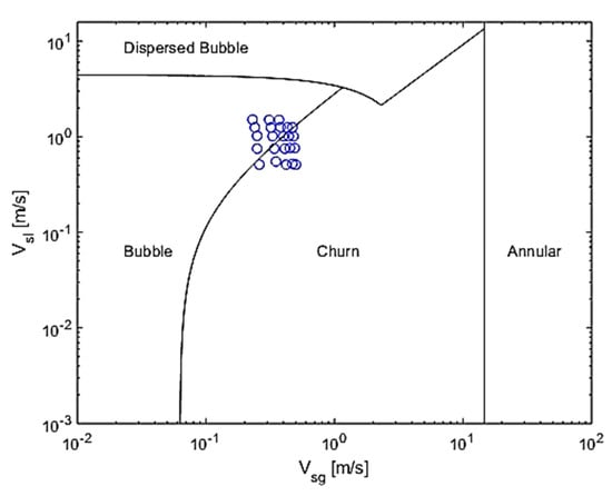 To better illustrate the velocities chosen, the superficial velocity pairs are plotted in the Taitel et al. [] mechanistic map for vertical gas-liquid non-swirling flows shown in Figure 4. The churn-slug transition is not plotted in the map, as the 1 m (≈) between the Swirl Element and the gas injection is not sufficient for the development of a slug flow for the velocity range studied according to the article’s theory. Figure 4 indicates that the experimental points are situated around the bubble-churn transition, although no verification of the patterns was performed during the experiments.