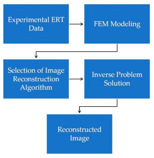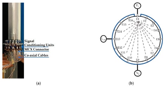 ERT based sensors are used to obtain conductivity distribution of the media under observation, and this can be achieved by placing sensing electrodes in contact with the targeted medium []. Due to considerable conductivity differences between air and water phases, the gas core can be efficiently detected using ERT. A typical ERT system comprises of ERT sensor, a Data acquisition system, and image reconstruction, and visualization software [], as shown in Figure 2.