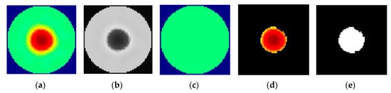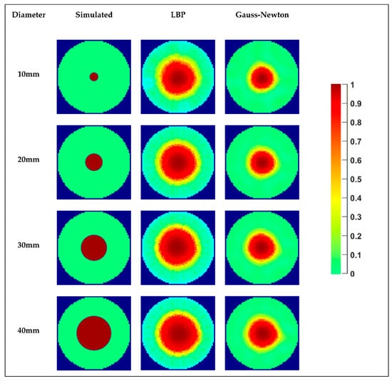In this study, the difference imaging (DI) technique was used using both LBP and GN methods. In the DI method, the sensitivity matrix is pre-calculated for the sensor geometry using the forward model data, and it is used to get a reference image from the measurements []. The difference conductivity vector can be described as: