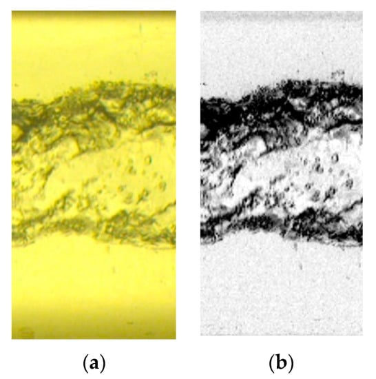 The second tested approach consists of a semi-automatic image segmentation technique called the Graph cut method (GCM) [,]. GCM is used to label the image into the foreground and background. Thus, the gas phase can be regarded as a foreground and the liquid phase as a background. The segmented image was further processed with operations like border clearing imclearborder and holes filling imfill to improve the segmentation quality. The whole procedure of image processing is described in Figure 8.