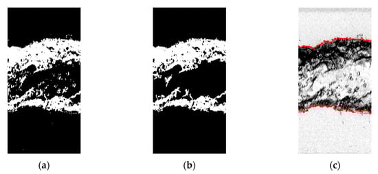 A gas core is expected in the images from the flow physics. Then, a for-loop is written to estimate the gas core diameter for each column of pixels inside the image by searching for the maximum radial position where the value of 1, representing the interface, is followed by 0, representing the water annulus. The image processing steps using MATLAB are illustrated in Figure 11, with the reconstructed core interface represented in red in Figure 11c.