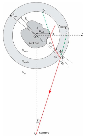 The filmed images present a distortion in the relation of the real flow inside the pipeline due to refraction in the transitions between materials, being significantly affected by the curved wall of the pipeline. To better approximate the gas core interface position observed in the images to the real location taking place inside the pipe, the path of the light rays being reflected by the gas-liquid interface is studied based on [], according to the schematics of Figure 12.