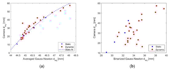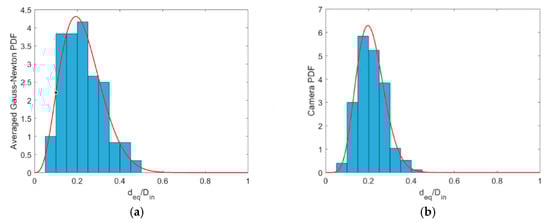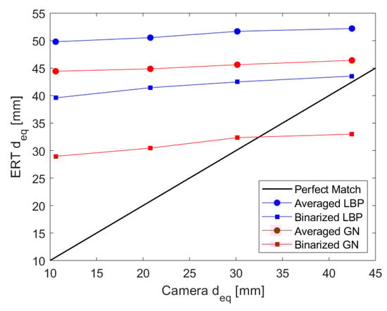 To further test the proposed approach, two-phase flow measurements were done at different gas and liquid superficial velocities, and the gas core diameter calculated by both imaging modalities were compared. The results from both camera and ERT follow the same trends of diameter change by varying the gas velocities at a fixed liquid velocity. The correction factor computed by static measurements was used to correct the gas core diameter obtained by ERT, achieving below 20% divergence in relation to the measurements departing from the fast camera. Also, the correction function obtained for static measurements also fits well the dynamic measurements, enabling its use for diameter core size estimation during IFS experiments (this reflects in the R2 values). PDFs of the camera and corrected ERT values for each experimental point were compared, and a good agreement between the curves was noted, although the proposed method shows limitations in measuring the instantaneous gas core size when breakages are frequent.