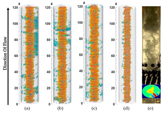 A set of flow images from the fast camera were recorded at 50 Hz, while the flow measurements obtained from a single layer 16-electrode ERT sensor placed 500 mm downstream of the swirl element were acquired at 12 Hz. During each experiment, 1 min of ERT raw data was recorded using the TomoKisStudio software []. Due to the memory occupied by the fast camera images, only the last 10 s were captured, always starting when the ERT reaches about 600 measurements.