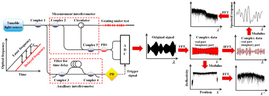 The RFG characterization setup is shown in Figure 1. The optical system comprised a tunable laser source, an auxiliary interferometer, a measurement interferometer, and an optical receiver system. With the tunable laser sweeping its output frequency linearly, an optical beat wave is generated in the auxiliary interferometer, which is used to trigger the sampling of the signal from the measurement interferometer at equal intervals of wavelength. In the measurement interferometer, the tunable light is launched into two arms: one arm is the reference arm and the other arm is connected to the grating under test. Light reflected from different positions along the grating generate different beat frequencies with the light in the reference arm. The beat signal is then collected by the photodetector and sent to the analog to digital conversion (ADC) system, which is the original real-valued signal that we get from the OFDR setup in the wavelength domain. The data processing method used to characterize the RFG is shown on the right side of Figure 1. First, by doing a fast Fourier transform (FFT) of the original real-valued signal in the wavelength domain, a complex data set containing the amplitude and phase of the reflectivity can be calculated in the spatial domain. The reflectivity of RFG at different positions is then obtained by taking the modulus of the complex signal in the spatial domain. In order to study the reflectivity characteristics of the RFG along the spatial domain, an FFT is also applied to the modulus of the reflectivity for further analysis. At the same time, an appropriate window is applied to the complex data in the spatial domain with an inverse FFT (IFFT) to transform the signal back to the wavelength domain. The restored data in the wavelength domain is also a complex data set with its modulus representing the local spectral response of the selected locations of the RFG. The fine structures of the spectral response of the RFG is then analyzed with another FFT calculation.