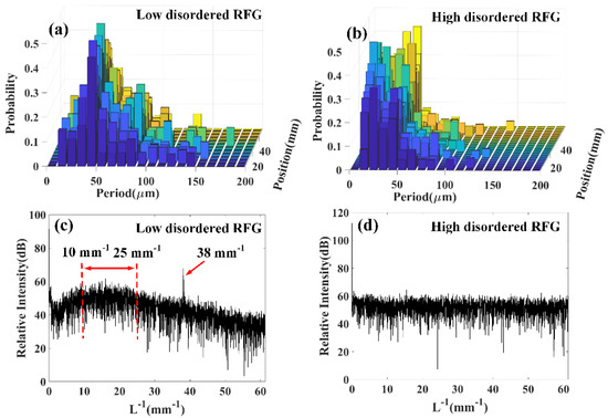 To further illustrate the influence of the degree of randomness to the grating’s reflectivity property, a probability histogram of the reflection intensity fluctuation period at every 1 mm range of the RFG was plotted. The reflection intensity fluctuation period here refers to the distance between two adjacent local minima points in Figure 2. It can be seen from Figure 3a that for the low disordered RFG, the fluctuation period was most likely located at 50 μm. In contrast, Figure 3b shows that the fluctuation period in the high disordered RFG is most likely located between 10 μm and 50 μm. Because the spatial resolution of the OFDR setup in the experiment was 8 μm, each point in Figure 2 represents the light reflection strength in the local area. The histograms of Figure 3a,b indicates that the low disordered RFG showed periodical reflectivity features in the spatial domain, while the high disordered RFG exhibited stochastic reflection intensity distribution. The difference was also caused by the partially correlated phase superposition in the low disordered RFG and the stochastic phase superposition in the high disordered RFG. By selecting the RFG part in Figure 2 and doing a Fourier transform of the modulus of the reflection intensity, the intensity fluctuation frequency was calculated, which is shown in Figure 3c,d. It can be seen that the relative intensity at each fluctuation frequency in the high disordered RFG was quite flat, indicating that there is no particular fluctuation frequency and the reflection intensity at different positions was totally randomly distributed. In contrast, the fluctuation frequency of the low disordered RFG showed an envelope where the maximum value was located between 10 mm−1 and 25 mm−1, corresponding to the approximately 20 oscillations in the 1 mm range of the inset figure in Figure 2a. The periodic intensity fluctuation feature in Figure 2a resulted from the relatively small period fluctuation range of the sub-gratings in the low disordered RFG. It is interesting to note that there was a small sharp peak at 38 mm−1 in Figure 3c, although it is hard for us to directly see the 38 oscillations of intensity fluctuation in the 1 mm range. The 38 mm−1 oscillation frequency in the spatial domain comes from the inverse of the sub-grating’s length (~0.025 mm). The sharp peak further proves that low degree of randomness in a fiber grating would lead to periodic reflection intensity features in the spatial domain.