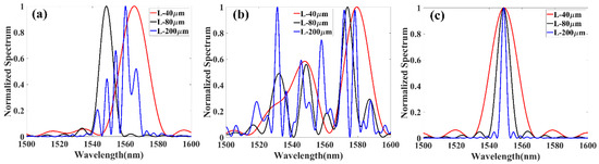 Thanks to the high spatial resolution of the OFDR technique, the local spectral response of the RFG could be characterized. The influence of the grating length to the local spectral response property was first studied both in low and high disordered RFGs. It can be seen from Figure 4a that when the interrogation length was chosen to be 40 μm and 80 μm, the local spectral response of the low disordered RFG only had one dominant peak, indicating that the refractive index fluctuation under the length of 80 μm was not random enough to create multiple reflection peaks in the spectral domain. When the interrogation length was increased to 200 μm, multiple reflection peaks started to appear due to the period change of the sub-gratings in the local region. The local spectral response in the high disordered RFG in Figure 4b revealed different properties. When the interrogation length of high disordered RFG was chosen to be as small as 40 μm, multiple peaks still appeared in the local spectral response and the peak number increased as the interrogation length elongated. The local spectrum of the high disordered RFG showed a larger number of peaks than the low disordered RFG, which was caused by the relatively high degree of randomness in the high disordered RFG. As a comparison, the local spectral response of a regular weak FBG was also measured. It can be seen that for regular uniform FBG, there is only one dominant reflection peak regardless of the grating’s length, illustrating that the higher degree of randomness would induce more reflection peaks in the spectral domain.