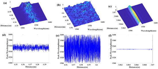 Figure 5 shows the distributed local spectral response of the low disordered RFG, high disordered RFG and a regular uniform FBG. The interrogation length was chosen to be 40 μm. The top three figures show their three-dimensional local spectral response at every position, and the bottom three figures are the corresponding peak wavelength value in the spatial domain. It can be seen that in the regular uniform FBG, the peak wavelength of the local spectral response was always located at 1550 nm, except for some small deviation at a particular position. The standard deviation of the distributed peak wavelength in regular uniform FBG was 0.1 nm. The reflection strength in the middle part was stronger than both sides of the measured uniform FBG, which also agreed with the reflectivity changing trend at different positions, shown in Figure 2c. For the low disordered RFG, the peak wavelength of the spectral response at each local section randomly changes from 1540 nm to 1570 nm, with a standard deviation of 6.72 nm. In contrast, the corresponding peak wavelength of each local section in the high disordered RFG covered the total wavelength range from 1500 nm to 1600 nm, and the standard deviation is 26.65 nm, which was 4 times larger than the corresponding value in the low disordered RFG. Both the low and high disordered RFGs had a much larger standard deviation of distributed peak wavelength than regular uniform FBG. The local spectral response showed that the higher degree of randomness could provide richer reflection peaks for the RFG in the spectral domain and resulted in larger peak wavelength fluctuation in the grating’s spatial domain.