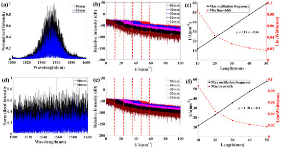 When a laser beam propagates in a random medium, its lightwave nature leads to many interesting phenomena. For example, the well-known Anderson localization in a random medium is now understood to be a universal wave phenomenon due to multi-scattering and coherent interference [19,20]. Shapira and Fischer studied the light localization effect in an RFG array in single-mode fiber [18]. They showed that for a stack of N sub-gratings with randomly varying intervals, the transmitted intensity decays exponentially rather than linearly with the number of sub-gratings N. Actually, due to light multi-scattering and coherent interference, the reflection spectrum from a random medium shows narrow linewidth peaks in the spectral domain. Those narrow linewidth peaks act as a narrow linewidth filter in the application of random fiber lasers [7,11], which is an important feature of RFG. Figure 6a,d shows that the high disordered RFG had a very broadband reflection spectrum envelop while the low disordered RFG had stronger reflection at particular wavelengths from 1520 nm to 1580 nm. Both high and low disordered RFGs have many fine structures in the reflection spectrum. An important feature of those fine structures is the linewidth of each small peak, which could be analyzed by doing Fourier transform to the reflection spectrum. Because lightwave interference and multi-scattering are affected by the length of RFG, reflection spectra for different RFG lengths are studied. Figure 6b,e are the Fourier transforms of the reflection spectrum in Figure 6a,d, respectively. It can be seen that there is always a drop point after the FFT calculation, which corresponds to the maximum oscillation frequency of the reflection spectrum. When the length of the RFG is 50 mm, the maximum spectrum oscillation frequency is around 60 nm−1 for both low and high disordered RFGs. The maximum spectrum oscillation frequency increases linearly with increased RFG length, indicating that the minimum linewidth of the fine spectrum structures decrease inversely proportional to the grating length, as shown in Figure 6c,f. The maximum spectrum oscillation frequency was not affected by the degree of randomness, as low and high disordered RFGs showed similar behavior in Figure 6c,f. A question here is whether the OFDR setup had enough spectral resolution to characterize the fine structures of RFG. In [21], the spectral resolution of the OFDR setup is as small as 3.94 pm when the spatial resolution is set at 3.85 mm, corresponding to the maximum measurable spectrum oscillation frequency (0.5/3.94 pm) of 147 nm−1. The 50 mm length of the RFG in our experiment is much longer than 3.85 mm and the maximum 60 nm−1 spectrum oscillation frequency is also smaller than 147 nm−1. Therefore, the OFDR setup has adequate spectral resolution to characterize the fine spectrum structures of the RFG.
