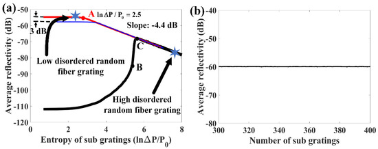 where is the length of each sub-grating. is the coupling coefficient between the counter-propagating beams in the gratings, which is determined by the refractive index modulation, is the wave-number deviation from the Bragg wavelength, is the grating period, and . The relationship between the entropy of the sub-grating and mean reflectivity of the RFG is simulated first, as shown in Figure 7a. The main simulation parameters in Figure 7a are as follows. The refractive index modulation is , and every 50 uniform index modulation periods form a sub-grating, and the total number of sub-gratings is 380. The mean reflectivity is calculated by averaging the reflectivity of the RFG in the spectral domain. The period variation range is divided by a constant () for normalization, thus the entropy of sub-grating is expressed as . The red curve is the result when the median value of sub-grating’s period is 0.5382 μm (corresponding to the central wavelength of 1550 nm) and the black curve is the result when the median value of sub-grating’s period is 0.6500 μm (corresponding to the central wavelength of 1872 nm). The red curve shows that the mean reflectivity of the RFG remains almost constant when the sub-grating’s entropy is smaller than 2.5 (before point A). This is similar to the conserved transmittance area theorem that is proved in [24], which claims that the total area under the curve of the transmittance in the reciprocal wave vector space remains constant regardless of the amount of disorder. However, when the grating’s period variation range continues to increase after point A, the reflectivity in dB scale decreases linearly with the increase of the sub-grating’s entropy. This is because the wavelength range in our simulation only covers from 1500 nm to 1600 nm. With increasing entropy of the sub-grating, the reflected energy is dispersed from the central wavelength to other wavelengths. If the dispersed wavelength range is smaller than the calculated wavelength range in the simulation (or wavelength range used for measurement in the experiment), the total reflectivity of the RFG remains constant. When the sub-grating’s entropy is large enough, the dispersed wavelength range would exceed our measured wavelength range, and the reflectivity of RFG at a fixed wavelength range would decrease exponentially as the sub-grating entropy increases. The two stars on the curve represent the two RFGs that were measured in the experiment by the OFDR setup. The period variation of the low disordered RFG in the experiment was 10.8 nm, corresponding to 2.38 of sub-grating’s entropy (). The period variation of the high disordered RFG was 2.5 μm, corresponding to 7.82 of sub-grating’s entropy (). The simulated average reflectivity of the high disordered RFG is 22 dB lower than that of the low disordered RFG, which is very close to the experiment result (~20 dB). Since the simulated random period of the sub-gratings is assumed to have a uniform distribution, the entropy of the high disordered RFG in the experiment was a little overvalued as the random period of the sub-gratings was more likely to be focused on a particular region. Considering this factor, the simulation results agreed well with our experimental results. The wavelength range is selected to be from 1500 nm to 1600 nm because the wavelength range of the tunable laser in the experiment is from 1500 nm to 1600 nm. A larger wavelength calculation range does not affect the mean reflectivity changing trend of the RFG. For example, the blue curve in Figure 7a represents that the calculated wavelength in simulation ranges from 1450 nm to 1650 nm. Since the wavelength range of the blue curve is two times larger than that of the red curve, the mean reflectivity in the blue curve is 3 dB smaller than that in the red curve when the entropy of sub grating is small, which means the total reflectivity of the RFG in these two cases is same. When the entropy of the sub grating is large, the blue curve also shows that the average reflectivity of the RFG in dB scale decreased linearly as the increase of the entropy of sub gratings. In order to study the reflectivity of the RFG that is out of the central wavelength range of the sub-grating, the median value of the sub-grating’s period is set at 0.6500 μm, as shown of the black curve in Figure 7b. When the sub-grating’s period variation range is smaller than 0.0944 μm (before point B), the total reflectivity of RFG increases slowly as the increase of sub-grating’s entropy. The wavelength from 1500 nm to 1600 nm located at the bandpass region of a uniform FBG with a grating period of 0.6500 μm, which is a result of the destructive interference of light. If small-period variation is introduced to the sub-grating, the destructive interference would be disturbed, leading to an increase of reflection intensity. When the sub-grating’s period variation range is between 0.0944 μm and 0.1292 μm (between point B and point C), the total reflectivity of RFG increases dramatically as the increase of sub-grating’s entropy. The dramatic increase relies on that the central wavelength of the sub-grating starts to cover the wavelength range from 1500 nm to 1600 nm when the sub-grating’s period variation range is larger than 0.0944 μm. If the sub-grating’s entropy continues to increase (after point C), the reflectivity of the RFG decreases exponentially as the increase of the sub-grating’s entropy after the central wavelength of the sub-grating totally covers the wavelength range from 1500 nm to 1600 nm. In order to study whether the average reflectivity of the RFG is dependent on the number of sub-gratings or the total entropy of the RFG, the number of sub-gratings is changed from 300 to 400 while the total length of the RFG was fixed (10 mm). Due to the requirement of the slowly varying approximation in the transfer matrix method, the number of the periods in each sub grating should be a suita