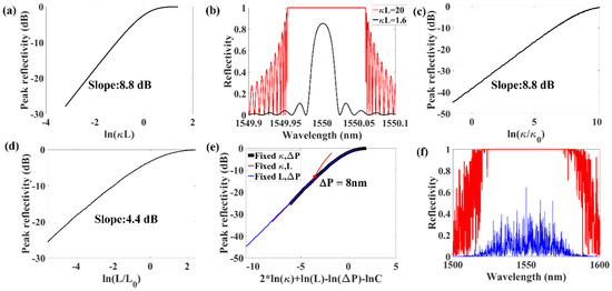 The experimental results show that the linewidth of the fine spectrum structures of the RFG decrease inversely proportional to the increase of the RFG length, which was similar to the linewidth of a regular FBG () when . Otherwise, the linewidth of a regular FBG was proportional to the coupling constant () if [21]. The relationship between the peak reflectivity of a regular FBG and show different characteristics in these two conditions. When , the peak reflectivity of an FBG in dB scale increases linearly with the increase of . In contrast, the peak reflectivity of an FBG is close to 100% if , as shown in Figure 8a. Figure 8b shows the spectrum of an FBG at different conditions when and . When random period variation of the sub-gratings is introduced into the grating, the peak reflectivity of the RFG is reduced and the criteria that or can be used to estimate the grating properties is no longer valid. In order to find the proper criteria that can estimate the properties of the RFG, the peak reflectivity of the RFG is shown in Figure 8c–e. There is a linear relationship between the peak reflectivity of the RFG and ( is a constant) with a slope of 8.8 dB when is relatively small, as shown in Figure 8c. Similarly, Figure 8d shows that the relationship between the peak reflectivity and ( is a constant) is also close to linear with a slope of 4.4 dB when is relatively small. According to the simulation results in Figure 8c,d and Figure 7a, we concluded that the peak reflectivity of the RFG was determined by rather than , as the slope of the linear part in Figure 8d was two times the slope of the linear part in Figure 7a and Figure 8c. Figure 8e shows the relationship between the peak reflectivity of the RFG and , where was a dimensionless constant (). Since there were three variables and , there are three curves in Figure 8e, which is plotted by changing one of the variables among them and keeping the other two variables fixed. These three curves were overlapped with each other except when was smaller than 8 nm. The overlapping portion indicates that the peak reflectivity of the RFG was determined by when the random period variation was larger than 8 nm. When was smaller than 8 nm, the peak reflectivity property of the structure is similar to a regular FBG rather than a RFG. Figure 8f shows two typical spectral shapes of RFGs when (red curve) and (blue curve).