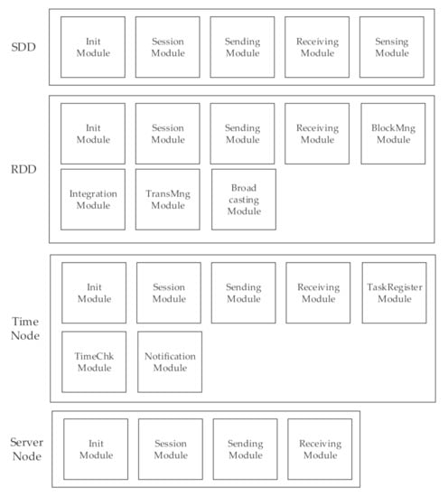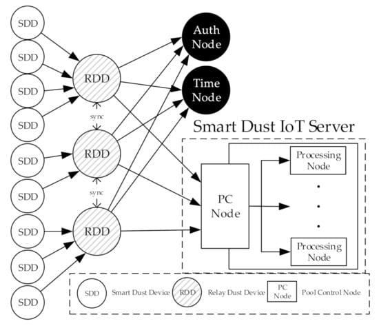 The proposed system in this study is based on the layered smart dust IoT system proposed in our earlier studies [,]. Figure 2 shows the physical device configuration of the smart dust IoT system using the lightweight blockchain. The two nodes in the figure need to be mentioned. The Auth node sends authentication information to RDDs. The Time node plays the role of determining synchronization time. A detailed description of the two nodes can be found in []).