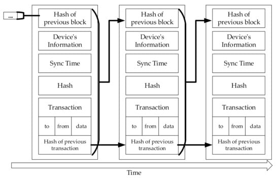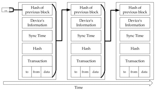 The creating and propagating of a new block/transaction stage creates a block/transaction and puts a transaction into a block. The stage begins by creating a transaction. After the transaction is created, the RDD’s device’s information is recorded in the “to” field, the SDD’s device’s information that collected the data is recorded in the “from” field, and the collected information is recorded in the “data” field. (Figure 4 shows an example of the blockchain used in a normal sensed data blockchain for this study.) After that, the device’s information and the hash of the previous block are written in the block, and RDD requests a commit time to the Time node. The time node that has received a request selects the earliest time in its scheduling table as the commit time. The selected commit time is marked in the scheduling table so that it cannot be allocated to other commit times. After the RDD receives the commit time from the Time node, the RDD records the commit time in the “Sync Time” field of the block. Finally, the block/transaction creation stage is completed by writing the result of hashing the current block by SHA 256 in the hash field.