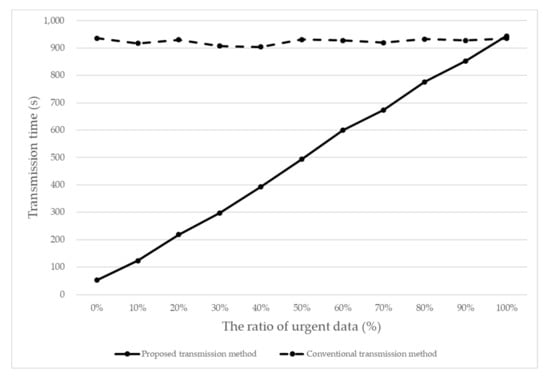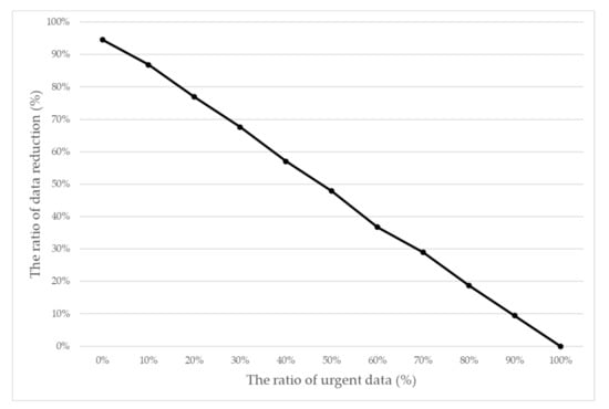 Figure 9 shows the ratio of transmission data reduction when the ratio of urgent data changes. The rate of transmission data reduction decreased as the ratio of urgent sensed data increased, which indicated the same meaning as Figure 8.