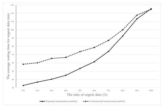 The results in Figure 10 show that the conventional transmission method provided more average waiting time by about 19% more time on average for the urgent sensed data. This meant that when the urgent sensed data was transmitted by the conventional transmission method, the urgent sensed data was delayed by 19%, compared to the proposed transmission method. In particular, when the ratio of the urgent sensed data was 10% (i.e., most of the transmitted data was the normal data), the average waiting time of the urgent data suffered a serious delay (by as much as 44%) in the conventional transmission method. In this case, the urgent data may not meet the urgent situation.